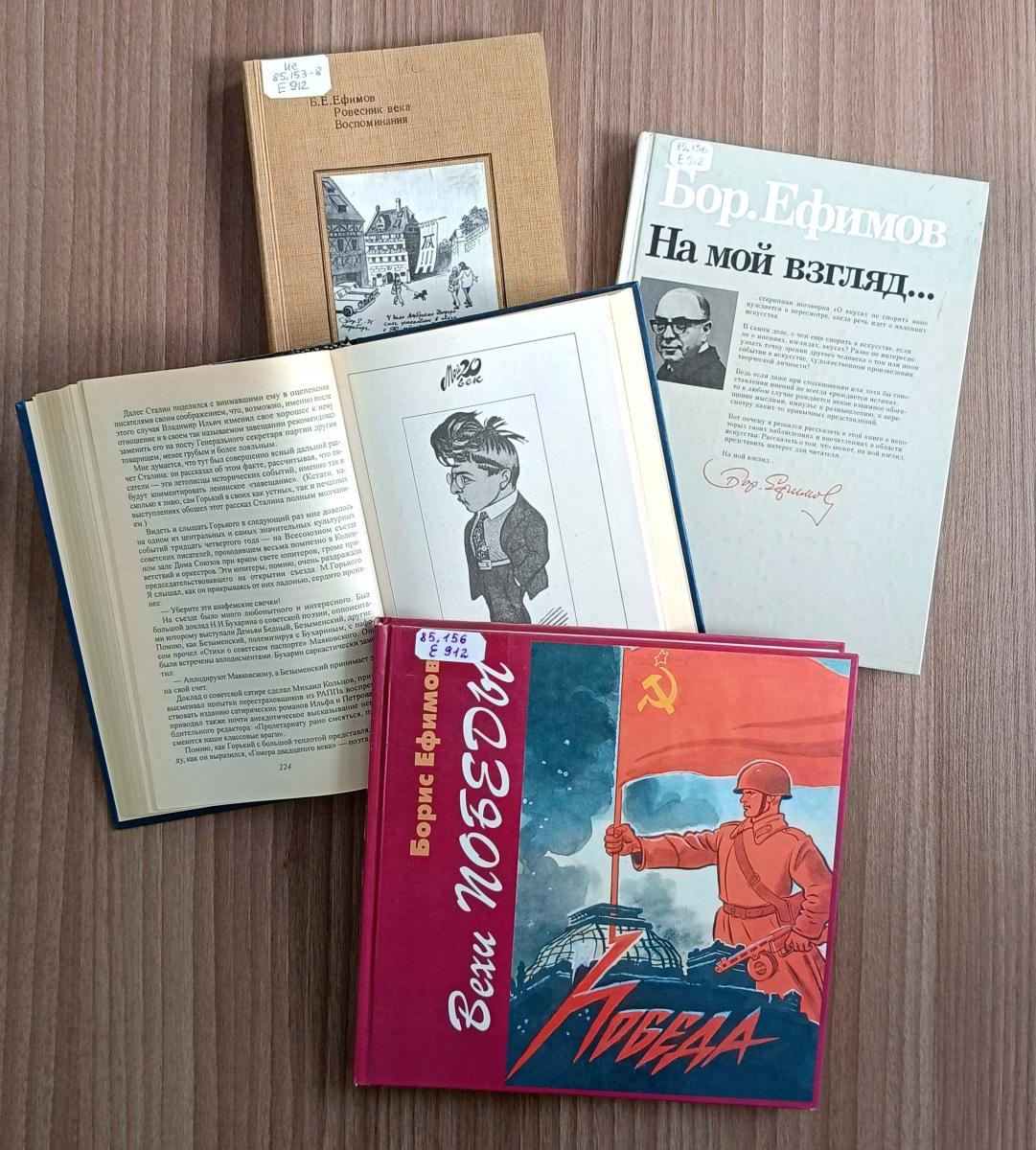 Борис Ефимов является автором серии литературных портретов и книг воспоминаний, где отразил важнейшие события XX века, свидетелем которых был лично. Поэтому его мемуары интересны не меньше, чем его творчество. С некоторыми из них – «Ровесник века. Воспоминания», «Десять десятилетий. О том, что видел, пережил, запомнил», «На мой взгляд» – вы можете познакомиться на выставке «Борис Ефимов. Легенда века» в отделе литературы по искусству.