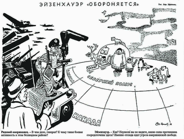 В послевоенное время художник продолжал активно работать. Иосиф Сталин считал карикатуру могучим оружием и однажды поручил Борису Ефимову высмеять американское военное присутствие в Арктике, сказав, что «это надо бить смехом!» Художник нарисовал вооруженного Эйзенхауэра, недоумевающего эскимоса, пингвина и мифическую русскую угрозу. Вышло смешно, собственноручная правка Сталина была незначительной. Надо сказать, что от внимания читателей не ускользнул изображённый среди обитателей Арктики пингвин. Однако ехидные замечания прекратились, когда стало известно, что рисунок одобрен Сталиным, и наличие пингвинов в районе Северного полюса было, таким образом, «узаконено».