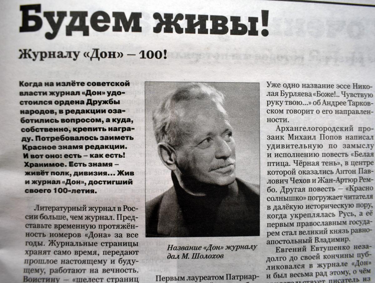 О литературно-художественном журнале «Дон», которому в этом году исполнилось 100 лет, рассказывает в «Литературной газете» его главный редактор Виктор Петров, лауреат Всероссийской литературной премии им. М. А. Шолохова.