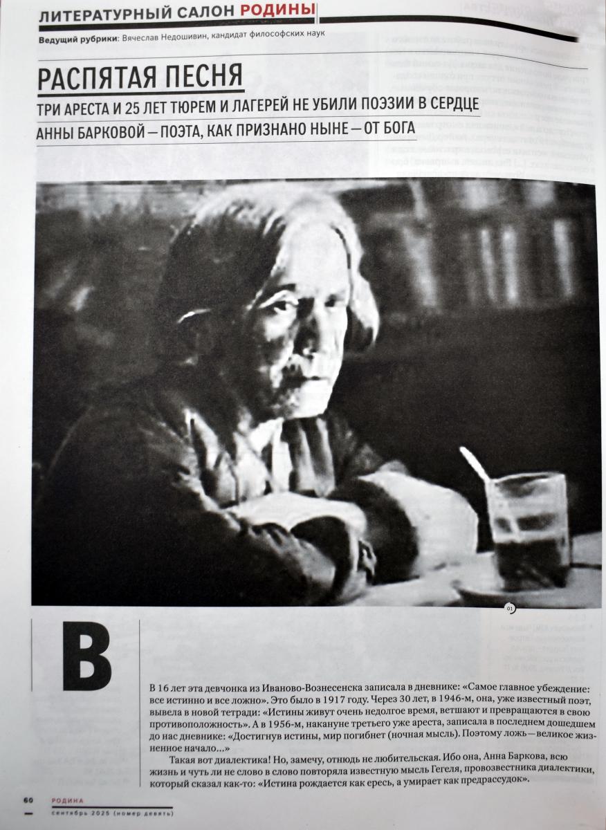 О судьбе поэтессы, у которой были изъяты исчезнувшие навек 95 страниц новой пьесы с интригующим названием «15 долларов и 30 рублей», повесть «Серое знамя», объёмную переписку и тьму стихов узнайте в журнале. О ней, предсказавшей то, о чём мы только догадываемся пока: о том, что XXI век будет не просто пародией – пародией на пародию минувшего столетия, в мире будет править «сапог вселенской пошлости…», читайте в девятом номере журнала «Родина» за 2025 год, в отделе периодических изданий библиотеки.