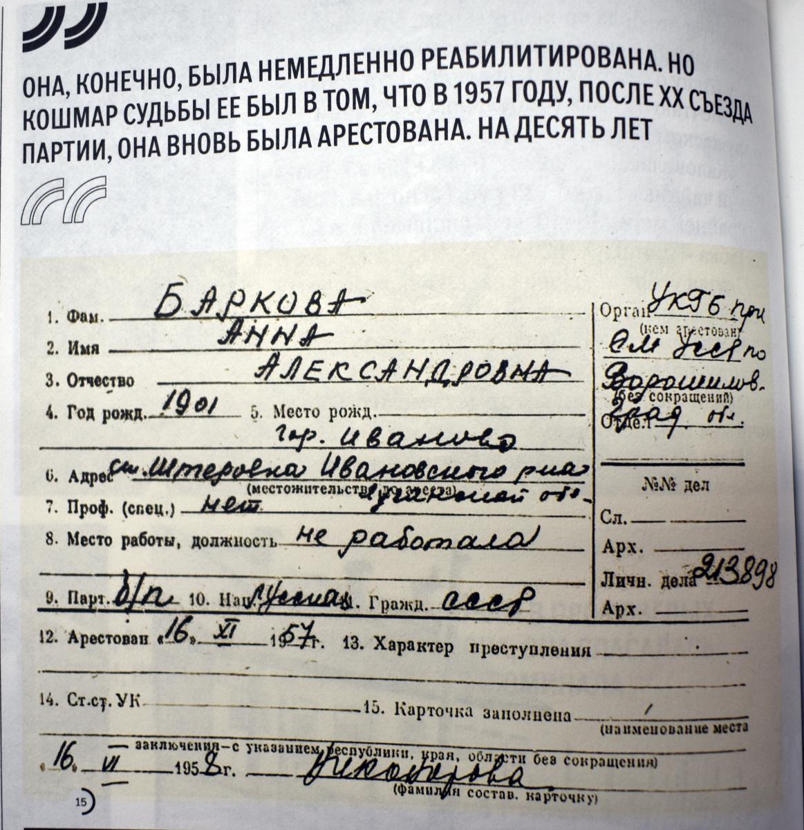В 1947-м её арестуют по доносу. Она защищалась, как могла: «Рукописи сохраняла для того, чтобы в дальнейшем их переработать… Но я не знала, что можно привлекать к ответственности за черновики…» В 1948 году, 16 февраля, суд приговорил её к 10 годам лишения свободы и поражению в правах на 5 лет. Приполярный лагерь спецрежима в Абезе, по воспоминаниям Барковой, «ни шить, ни вязать, ни вышивать, ни смеяться, ни плакать, ни отойти на 10 метров от барака было нельзя, за всё полагался карцер. Нас превращали в идиотов… Я отделалась неизлечимыми болезнями». Но зато у неё вновь пошли стихи, и какие! В Абезе она написала 100 стихов и поэму «Вера Фигнер» и опять наизусть. Так как знала, что мысль изречённая – преступление!