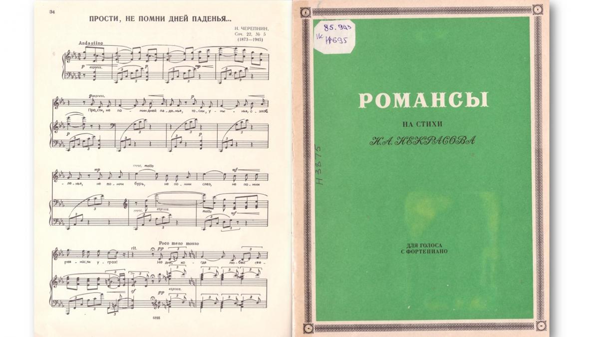 В секторе нот и звукозаписей отдела литературы по искусству Национальной библиотеки есть ноты романса Н. Н. Черепнина «Прости, не помни дней паденья…»: