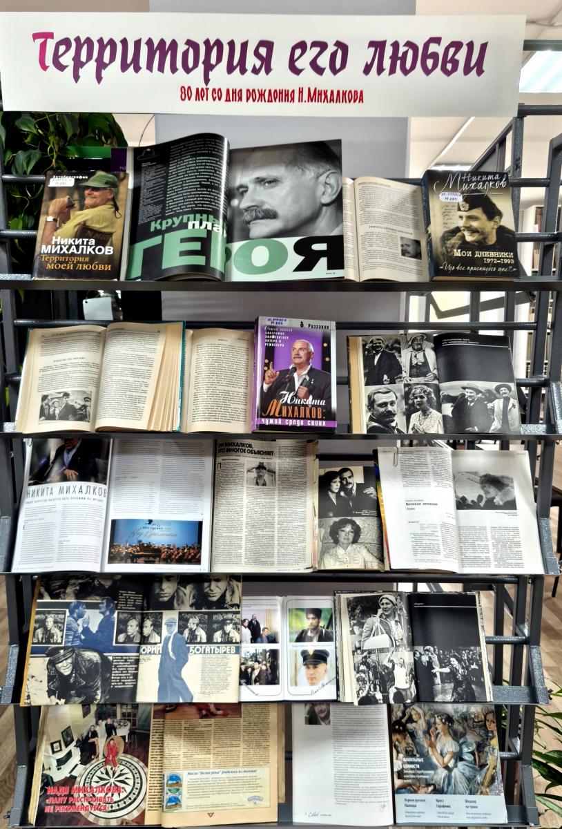 Сегодня, 21 октября, исполняется 80 лет со дня рождения известного актёра, режиссёра, сценариста, телеведущего, кинопродюсера, общественного деятеля Никиты Сергеевича Михалкова. В отделе литературы по искусству посетители библиотеки могут познакомиться с выставкой «Территория его любви», на которой представлены книжные и периодические издания, рассказывающие о жизненном и творческом пути Н. Михалкова.
