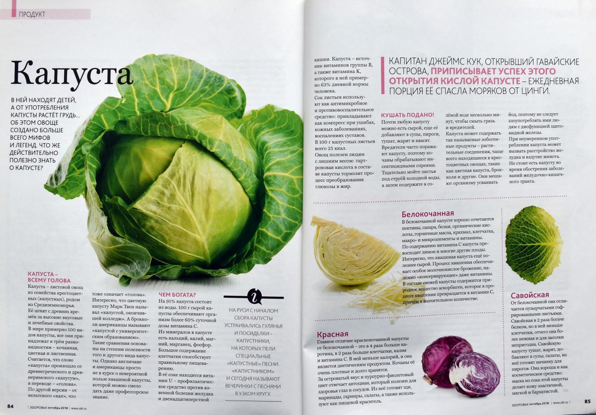 «Сто одёжек, и все без застёжек» – что это? Этот загадочный объект, безусловно, капуста, которая заслуженно занимает центральное место в наших садах и огородах. В октябрьском номере журнала «Здоровье» за 2018 год вышла статья, посвящённая этому уникальному растению.