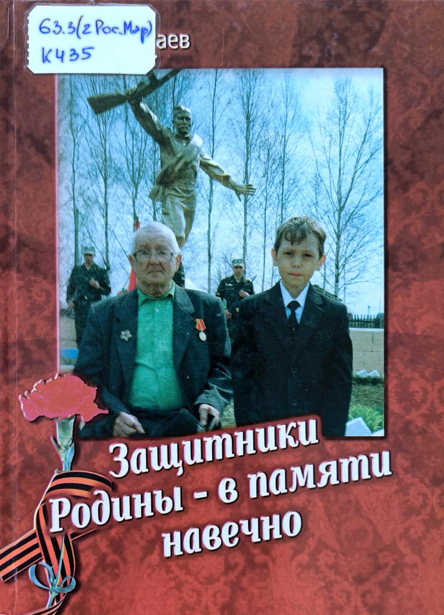 Автор книги «Защитники Родины – в памяти навечно» Леонид Никонорович Киртаев, используя документальные материалы, наградные документы, билеты участников войны, архивные материалы МАССР периода войны, отражает участие уроженцев Марийского края в войне 1941–1945 годов, их биографию, трудовую деятельность в довоенное и послевоенное время.