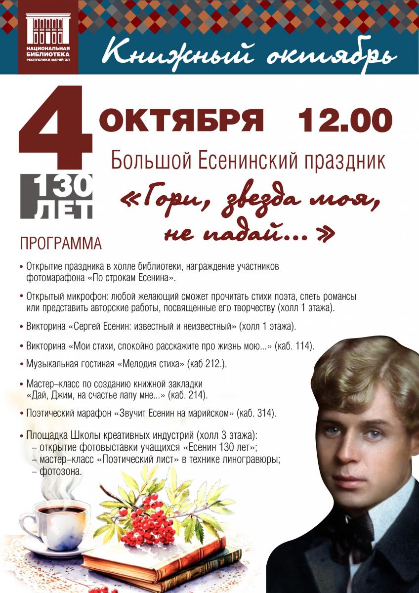 В рамках литературного фестиваля «Книжный октябрь» для посетителей и гостей Национальной библиотеки имени С. Г. Чавайна 4 октября состоится Большой Есенинский праздник «Гори, звезда моя, не падай…», посвящённый 130-летию со дня рождения русского поэта Сергея Есенина. Начало в 12 часов.